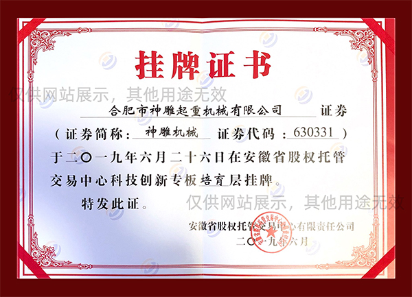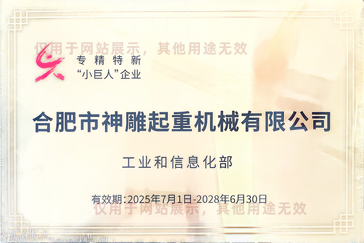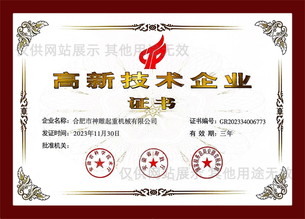 合肥神雕起重是高新技術(shù)企業(yè),是安徽省科創(chuàng)板掛牌企業(yè)(證券代碼:630331),同時榮獲安徽市場質(zhì)量、誠信五星級企業(yè)、合肥經(jīng)濟(jì)圈示范企業(yè)、合肥市創(chuàng)新型企業(yè)、安徽省市場質(zhì)量放心產(chǎn)品等榮譽(yù)稱號